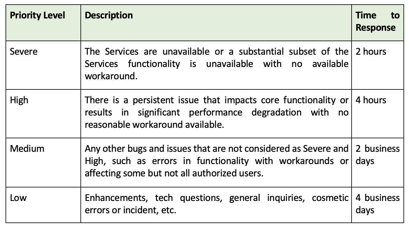 3. Support.In the event of any problems or errors involving the Services that GreenSight cannot immediately resolve, GreenSight shall begin working on a resolution to the problem and shall work diligently and in a commercially reasonable manner on the problem. Customer may contact GreenSight anytime via email at contact@greensighttech.com or via phone at (805) 225-7585. GreenSight will respond to service-related incidents and requests within the following time frames during normal business hours (Monday through Friday from 8am to 5pm PST, excluding holidays) and use commercially reasonable efforts to respond in accordance with the support table below.