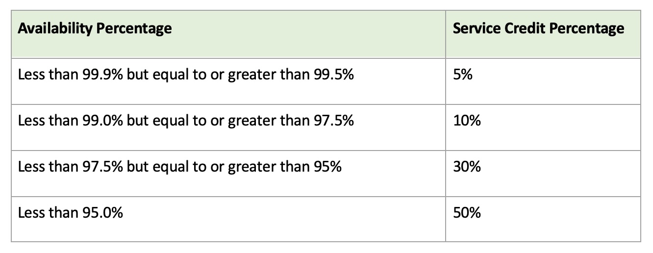 2. Service Credits. If GreenSight fails to achieve the applicable availability percentage in any calendar month, then, as Customer’s sole and exclusive remedy, and GreenSight’s sole liability, and only upon Customer’s written request within thirty (30) days of the end of such month, GreenSight shall issue a service credit in the amount corresponding to the percentages below. Service credits will be applied to a future purchase or amount owing and shall not be redeemable for cash or refund. The value of the service credit is calculated as a percentage of the pro rata monthly subscription fees paid by Customer to GreenSight for the Services under the applicable Order.